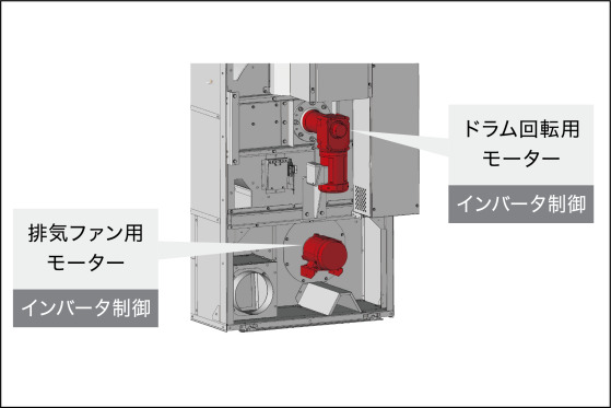 滾筒和排氣扇由變頻器控制,即使馬達功率較小,也能提供較高的烘乾性能。